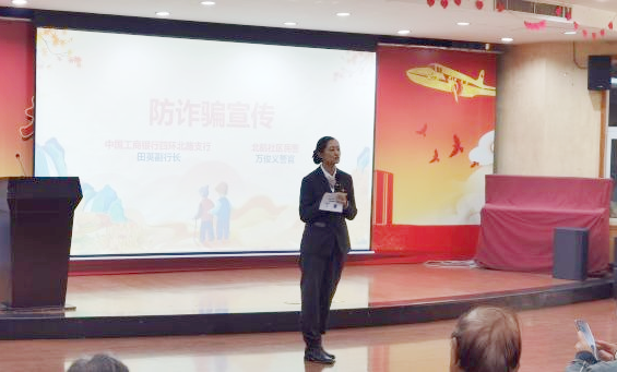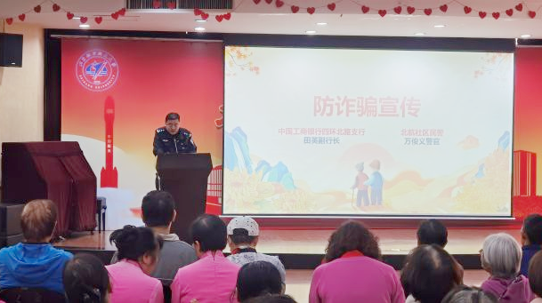 工行北京中关村四环北路网点支行副行长田英及花园路派出所民警万俊义受邀,通过沉痛案例与真实数据向与会居民宣传普及防止电信诈骗知识。