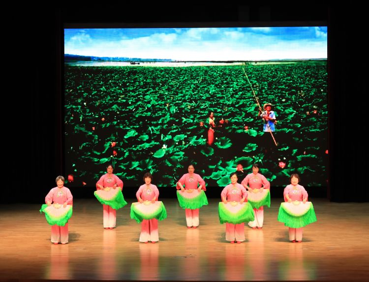 洪湖家乡美如画,渔舟唱晚福满舱,洪湖水浪歌声甜,晚霞舞蹈队用扇子舞出了《洪湖岸边是我家》。