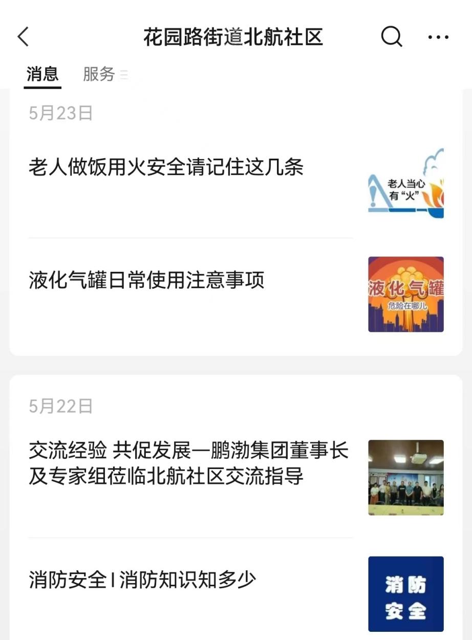 社区办通过微信公众号“花园路街道北航社区”发布社区消防安全工作举措以及居家消防安全注意事项、老人做饭用火安全、液化气日常使用注意事项等消防安全常识。