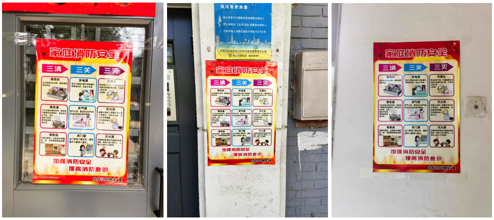 社区物业在每个住宅单元张贴“三清、三关、三灭”家庭消防安全宣传海报。