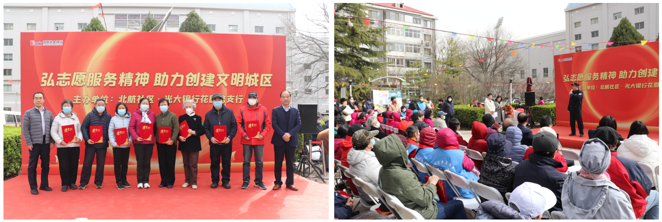 北航社区自2015年开始积极开展全民动员,充分发挥党建引领作用,共计有1000多名志愿者积极投身志愿活动。截至目前,形成了党员志愿服务队、楼门栋长志愿服务队、退役军人志愿服务队、维稳信息员志愿服务队、医护志愿服务队、社区文艺志愿服务队等十大志愿服务队伍,涌现出一大批无私奉献的优秀志愿者!他们用自己的行动,弘扬着奉献、友爱、互助、进步的志愿精神,投身到社区疫情防控、垃圾分类、为老服务等工作中。活动现场,首先向82位优秀志愿者们颁发了荣誉证书。同时,向一直为社区提供为老公益服务的四家社会服务机构颁发了荣誉证书。